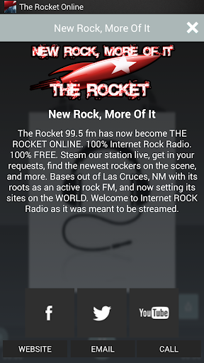 The Rocket 99.5 fm has now become THE ROCKET ONLINE. 100% Internet Rock Radio. 100% FREE. Steam our station live, get in your requests, find the newest rockers on the scene, and more. Bases out of Las Cruces, NM with its roots as an active rock FM, and now setting its sites on the WORLD. Welcome to Internet ROCK Radio as it was meant to be streamed.