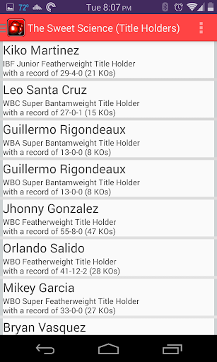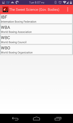 The Sweet Science application list upcoming boxing events that will be televised on HBO or Showtime. For each event you'll see the date of the event, the events location, the division and weight class, whether it's a title fight or on the undercard. From the events list you can also see a side by side comparison of the participants which show their height, arm length, age, record, country, and stance. Previous events from August of 2013 are also available. The application also comes with three other list, participants, governing bodies and title holders.