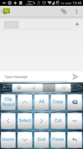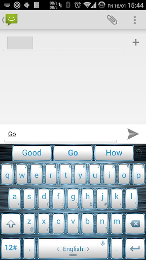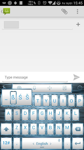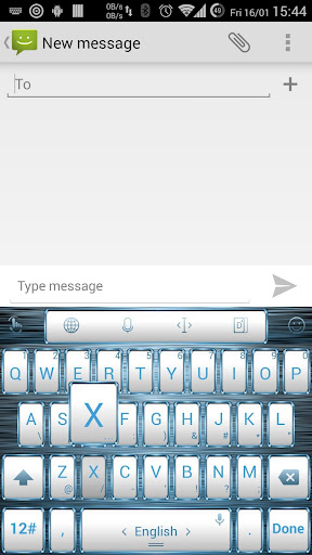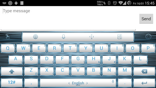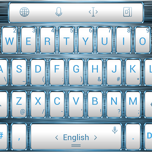 This theme will modify the look of your TouchPal Keyboard application with white ivory keys and blue metal frame over a brushed metal background.