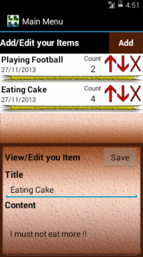 With this app you can store number of time you eat a specific meal, play a game, do an exercise, solve math problems, and many other actions as you wishes. The app is just a simple list created by the user in which each item in the list is given a title and a content.