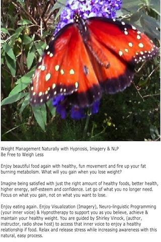 Enjoy eating again. Enjoy Visualization (Imagery), Neuro-linguistic Programming (your inner voice) & Hypnotherapy to support you as you believe, achieve & maintain your healthy weight. You are guided by Shirley Vinock, (author, instructor, radio show host) to access that inner voice to enjoy a healthy relationship if food. Relax and release stress while increasing awareness with this natural, easy process.