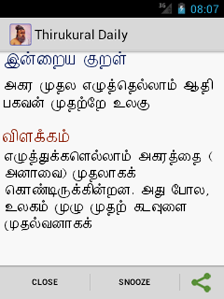 This application has the control to snooze it to view Thirukural later. If you are busy you can use this snooze feature.