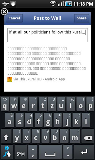 Facebook posting - You can post a kural on your facebook wall with your customized comments, where we think you will go creative with your friends