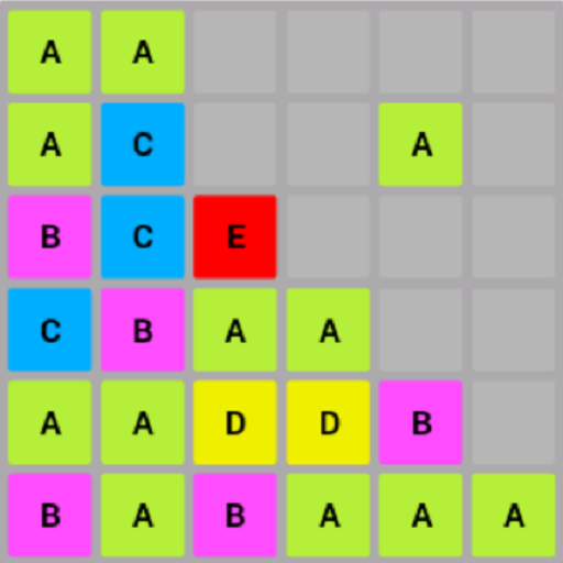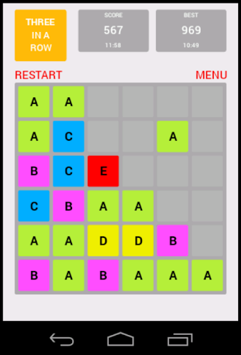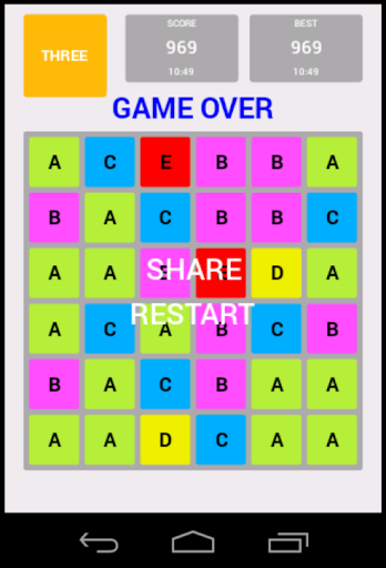 Swipe to move the tiles. Three A's in a row turn into a B. Three B's turn into a C, etc. Try to get the G. Good luck!