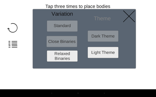ThreeBody provides a simulation of the "static three body problem" in which three bodies are placed with zero initial velocity. The three body problem is a surprisingly complex and chaotic problem than you can easily explore with this app.