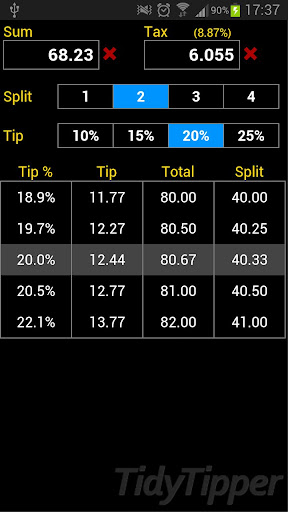A table will show the exact amount to pay to give the requested tip percentage. It also shows four rounded amounts and their corresponding tip percentage for a more convenient payment if you pay by cash.