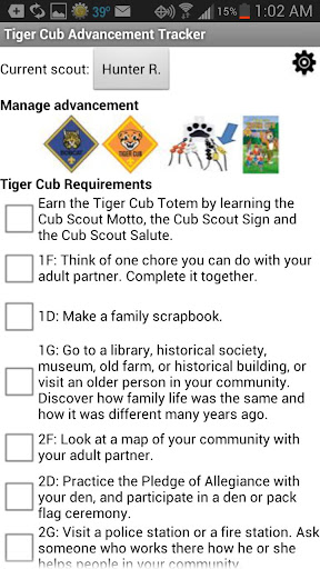 Tiger Cubs is the first and youngest division of the Boy Scouts of America Cub Scouts program. This Android app tracks completion of requirements for one or multiple boys for their Bobcat rank (a prerequisite for every rank), their tiger cub rank and all 50 tiger cub electives.