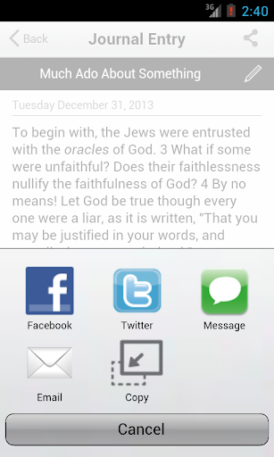 * Facebook Share: You can share a Program, Video, Bible passage, reading plan, journal entry or just a note with easy.