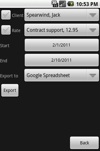 You can export your time sheet to either a csv file which will be saved on your sdcard, or email it to yourself or export it to a google doc spreadsheet.