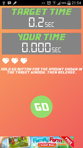 The object of the game is to hold the go button for the amount of time shown in the Target time window.