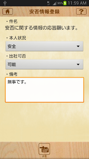 ◇震災などの災害時に自分の状態とGPSの位置情報を送信することができます。(安否確認機能)