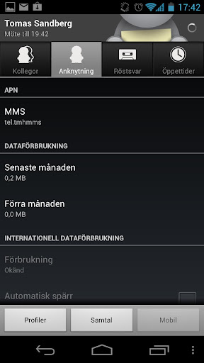 In TimeTel 2.0 you have the ability to report your GPS position to the operator and other colleagues. If you are a mobile customer you can check your data usage (in Sweden and abroad), your APN settings, and handle your data roaming usage. All colleagues and contacts are kept updated in the phones built in contact book so you can always see who's calling without the need to add the person to your contact book.