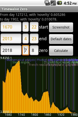 After calculating the graph, at the top of the screen you find the day numbers for both ends of the graph, and teh novelty level for those days. Day numbers count down from the past to the zero date.