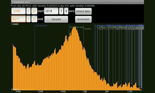 As envisioned by Terence McKenna, the timewave is made by using the King Wen sequence of the I Ching, the divination symbols used in China for thousands of years. Converted into a list of numbers, the I Ching sequence is used to calculate the level of 'novelty' for every day and displayed as a bar graph.