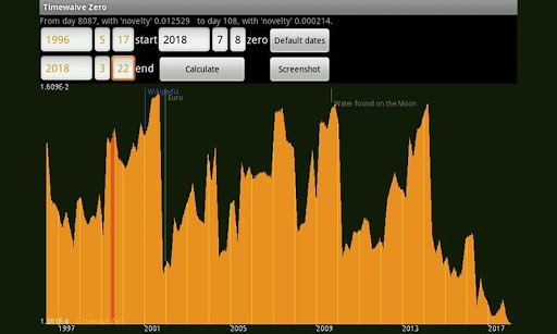 The third date (black numbers, marked 'zero') is the date where the graph reaches zero. Famously this was December 21, 2012. Peter Meyer has proposed a new date: July 8, 2018. You can set it to any other date and test how historic events will line up with tops and dips in the graph. For example the close approach of 99942 Apophis on Friday April 13, 2029.