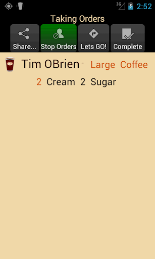 Now you can instantly notify people around you when your going on a coffee run, or share you run via web link. Friends can submit their orders directly to your mobile device. Manage your run by stopping order taking, messaging users or kicking orders off your list. When you’re ready to go click “Let’s Go” to see where your orders are physically located and the closest Tim Hortons. When you get back just click “Complete” to notify everyone where their coffee orders are.