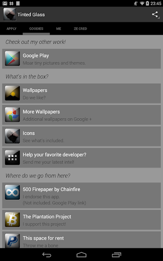 This is an icon pack for the most popular launchers like Nova, Apex, ADW and Action Launcher. I've designed a bunch of cool looking icons, intended to look as if the icons are presented within a slightly tinted piece of glass fused with the home screen surface. Cool, clean and classy. Apart from the ones I've done manually, I'm using icon masks to make sure that every launcher icon appears themed.