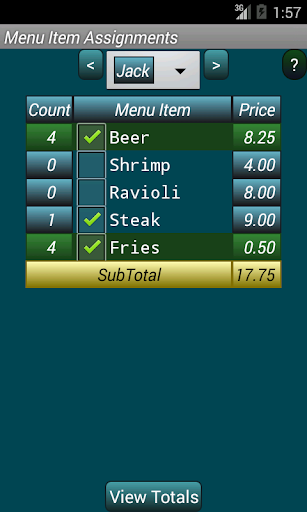Enter the subtotal, total tax, tip in percent, menu item names and prices, and optional peoples names, then assign menu items to each person and the tip calculator displays each person's individual bill. You can also set menu items as shared, and the cost is split equally.
