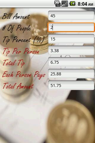 Feast on your meal in the comfort of knowing that you will know exactly how little tip to leave your undeserving server. Enjoy the looks of jealousy when your fellow companions realize you're not using just any old tip calculator, but the most suave and sophisticated tip calculator Android can handle.