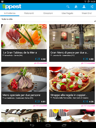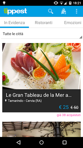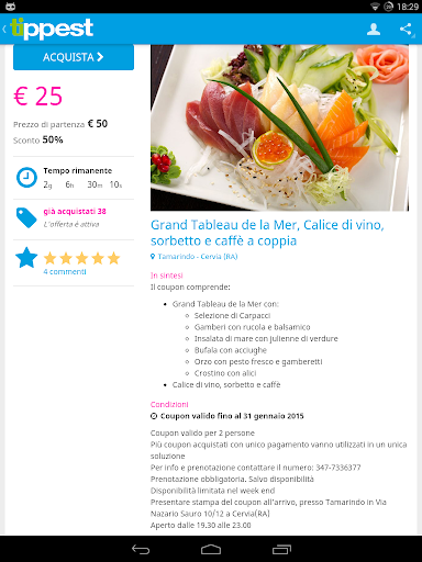 Tippest è il portale di social shopping dedicato a ristorazione, benessere, idee regalo e weekend. Propone agli utenti della sua Community, offerte speciali, con la formula del couponing, ad attività commerciali con sconti fino al 90%. Tutte le offerte proposte sono frutto di un’attenta selezione di fornitori e partner seri ed attendibili che, puntando sulla qualità, vogliono promuovere la propria attività. Ogni giorno dalla tua App puoi scegliere cosa acquistare, dove andare a mangiare, dove trascorrere le prossime vacanze, se prenotare un massaggio, un trattamento di bellezza o un taglio di capelli! Scarica l’ applicazione, guarda i dettagli dell’ offerta e la loro posizione sulla mappa, per poter raggiungere il luogo in pochi minuti! Registrati e inizia ad acquistare in completa sicurezza ed affidabilità. Il coupon arriverà via mail o sarà utilizzabile direttamente dall’App senza stampa. Infine non dimenticarti di condividere la tua esperienza sui nostri profili facebook, twitter, instagram e sul nostro blog. La tua opinione è la garanzia per gli altri di trovare soddisfazione ed il modo per noi di controllare che le nostre proposte siano garanzie di qualità. E se non trovi subito l’ offerta che ti interessa iscriviti alla nostra newsletter per ricevere le nostre proposte, scelte per te, via mail. Tippest! La Bella Vita a Metà Prezzo!