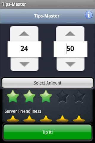Quality service should be rewarded with a quality tip. At the same time, a sub-par dining experience should be calculated accordingly. Too often, guests will opt for a default tipping percentage, when that amount may be greater or less than appropriate. With Tips-Master, you don’t need to worry about leaving the wrong amount. Tips-Master is the only tip calculator that allows you to rate your guest experience across three categories (speed of service, quality of food, attitude of server), and generates a recommended tipping amount based on your rankings.