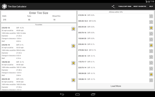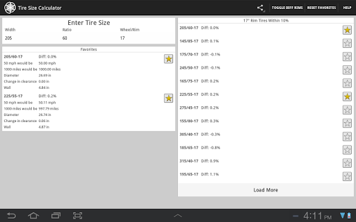 Enter your current tire's parameters (ie: 205/60-16) and you will see a list of tires sorted based on similarity.