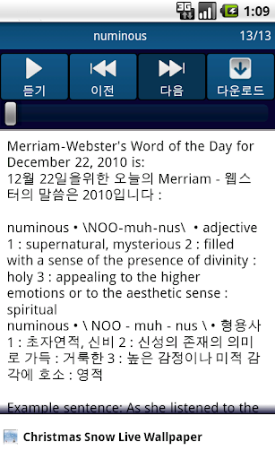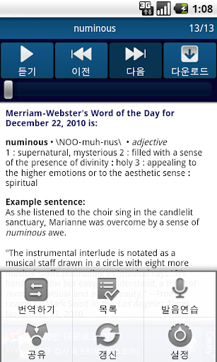 Today's English word from Merriam-Webster dictionary. You can practice your English word pronunciation with Google voice. Listen explanation of the English word from the podcast. Share meaning of English words with friends. Translation also supported. Home screen widget available.Could be a useful tool for English learners.