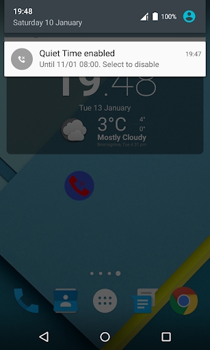 For this mode, you can decide whether to display a notification message which will show the date and time that quiet mode is scheduled to end. Selecting the notification or toggling the ringer mode through the widget, or enabling the ringer through any other means on the phone, such as pressing the volume up key (or setting interruptions mode to All in Lollipop), will immediately re-enable the ringer and cancel quiet mode. You can also chose which ring mode is set when Quiet mode ends – Vibrate only, Sound only or Sound & Vibrate.