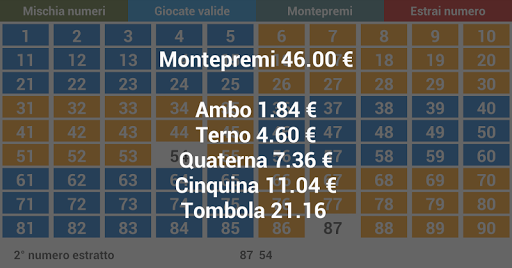 La tombola, soprattutto al sud, è un gioco tradizionale e popolare. Se ti piace giocare con la famiglia e gli amici durante le festività, allora puoi provare Tomboloid; estrae automaticamente i numeri, può mischiare i numeri durante il gioco come nel bussolotto e può dividere il montepremi in base alle giocate opzionate (ambo, terno, quaterna, cinquina e tombola). L'utilizzo è semplice: selezionare una delle voci presenti nella parte superiore; per ritornare allo schermo iniziale, tocco lungo sul testo bianco. Quello che conta maggiormente è il carattere prettamente ludico e di aggregazione del gioco.