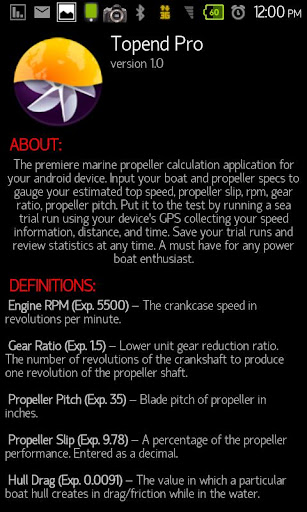 The premiere marine propeller calculation application for your android device. Input your boat and propeller specs to gauge your estimated top speed, propeller slip, rpm, gear ratio, propeller pitch, and hull drag. Put it to the test by running a sea trial/trial run and collecting your speed information, distance, and time. Save your trial runs and review statistics at any time. A must have for any power boat enthusiast.
