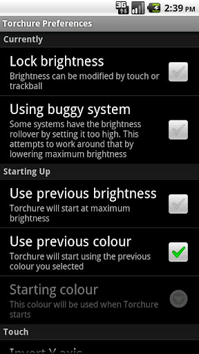 This is a simple torch with a few preferences to make it work for you. Adjust your brightness via touch or the trackball, lock it in place by clicking the trackball/pad, and Torchure will remember.
