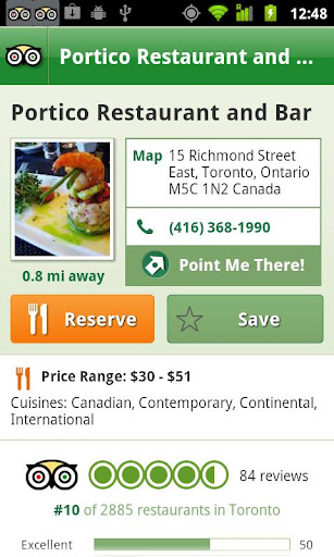 Once you have selected a restaurant or attraction, this app will guide you there using the fun & useful “Point Me There” screen, which uses the phone’s GPS and Compass.