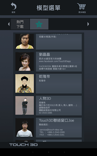本App建議配備為四核心1.5GHz、2G RAM與至少500MB以上ROM同等或以上,盡可能的呈現物體原貌故需較高規格,使用上若有任何問題,本團隊將盡力改善。Touch 3D 為手持裝置3D模型展示平台,歡迎將您的3D模型放置至Touch3D即可隨時隨地觀賞瀏覽您的模型。另有製作3D模型及掃瞄真人服務,請來電洽詢。