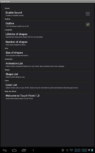 Touch Point turns your Android device into a fun, interactive (expensive) toy or game. It's like a drawing or painting app with a twist. It has several options for colors, shapes, and animations that provide a variety of ways to customize your experience. Touch Point is a great way to distract and entertain your bored kids - or maybe yourself! Could also be a useful tool to therapists. Multitouch is supported to the maximum extent that it's supported by your hardware.