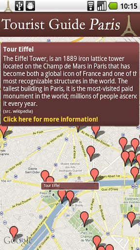 The Tourist Guide Paris is an ad-free travel application that helps you find the most popular sights, museums and parks of Paris, like the Eiffel Tower, the Louvre or the Champs Elysee.