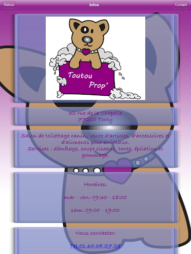 L'application "Toutou Prop" vous offre la possibilité de consulter toutes les infos utiles du salon de toillettage (Tarifs, prestations, avis…) mais aussi de recevoir leurs dernières News ou Flyers sous forme de notifications Push.