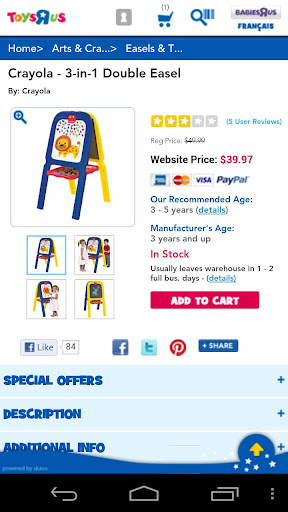 Shop anytime and anywhere! Toys"R"Us understands that as a busy parent your time is valuable when it comes to getting the best quality toys and advice from the brand that you trust the most. Our shopping app lets you find quality products to purchase right from your mobile phone. You will find all the same features that you have come to know and trust as our online store with some great enhanced features such as store locator that lets you find out hours and directions, weekly ads in your area and store, product information and customer reviews on every product to help you make the right decisions for your family. Want to check out product videos or find out details on a product? Simply use the bar code scanner that is built in.