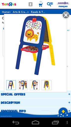 Magasinez de partout en tout temps! Toys"R"Us comprend qu’en tant que parent, votre temps est précieux quand vous recherchez les jouets de la meilleure qualité et des conseils de la marque en laquelle vous avez la plus grande confiance. Notre application de magasinage vous permet de trouver des produits de qualité que vous pouvez acheter immédiatement de votre téléphone mobile. Vous y retrouverez toutes les mêmes fonctionnalités que vous connaissez déjà de notre boutique en ligne, en plus de nouvelles fonctions améliorées qui vous permettront de trouver un magasin ainsi que ses heures d’ouverture et l’itinéraire pour s’y rendre, les promotions de la semaine dans votre région et à votre magasin, des informations sur les produits et des évaluations rédigées par nos clients sur tous les produits afin que vous puissiez prendre des décisions éclairées pour votre famille. Vous souhaitez voir des vidéos des produits et trouver des détails sur un produit? Utilisez simplement le scanneur de code-barres intégré.