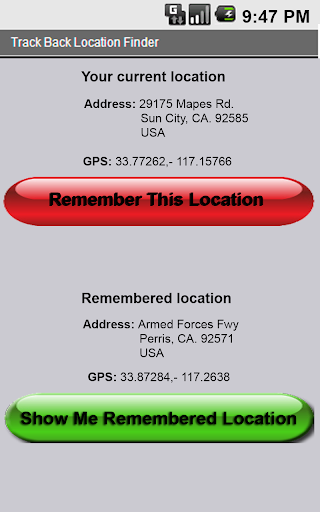 Have you ever forgot the way back to a location such as your parked car, campsite or where you were suppose to meet the kids or mom? This app is great for unfamiliar cities or for a forgetful person. Maybe you want to hide something and mark the spot? This app has the ability to do all these things and more. It has to be one of the easiest and most accurate GPS location finders on the market. Simply push the button to mark your location and when you want to return just push the button again. A map will lead the way no matter how far you may be. You can even turn the app off and when you turn it back on the location is still in memory. This app comes with instructions. (See our website for other useful apps) We also offer another version of this item here: https://play.google.com/store/apps/details?id=appinventor.ai_i8uwithalime.TrackBack