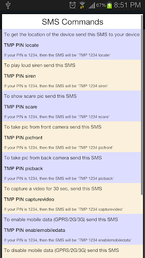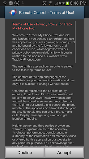To be in compliance with Google Policy, we will be showing notification in top bar whenever the app receives GCM command from our website. No other details other than registration details and status and result of command execution will be sent to the website. Registration details are stored securely in server located in US. Users can unregister any time and clear the details from server either through mobile or from website. The app cannot be used as spy app as app icon cannot be hidden and notification cannot be disabled. Please read EULA carefully before accepting.