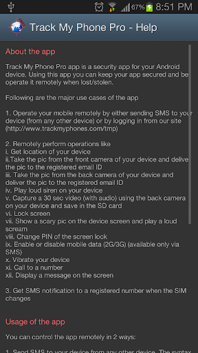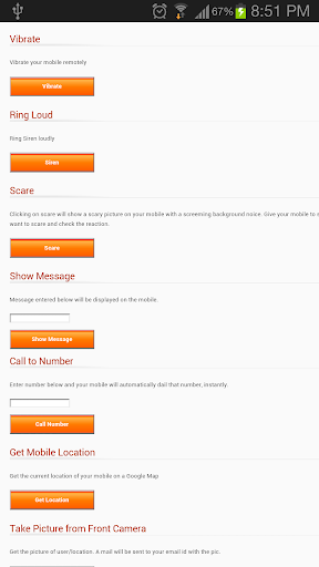 Track My Phone application helps you control and operate your mobile remotely either from our website or by sending SMS to your device from any other device. You can get the location of your mobile, make siren play loud, send a message to your mobile, call a number, enable or disable mobile data, make it vibrate for 5 sec, and even take pic remotely and email pics to your email ID. All this you can do even when your mobile is not with you.