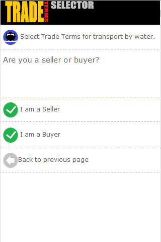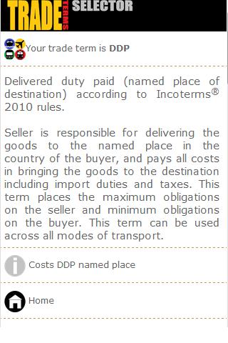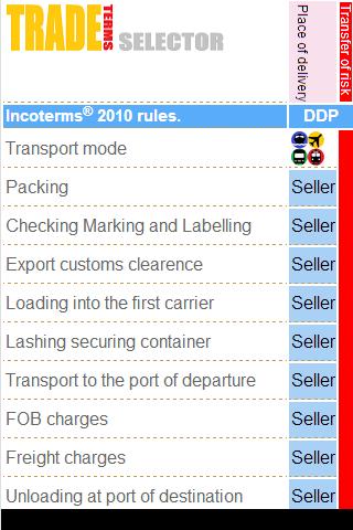 Trade Terms Selector for Incoterms ® 2010 rules is a tool special to select trade terms in line with Incoterms® 2010 rules. Within seconds we tend to guide you to your trade term based on the Incoterms ® 2010 rules and you get a transparent image wich costs you'll have to be pay for to get your merchandise on their final destination.