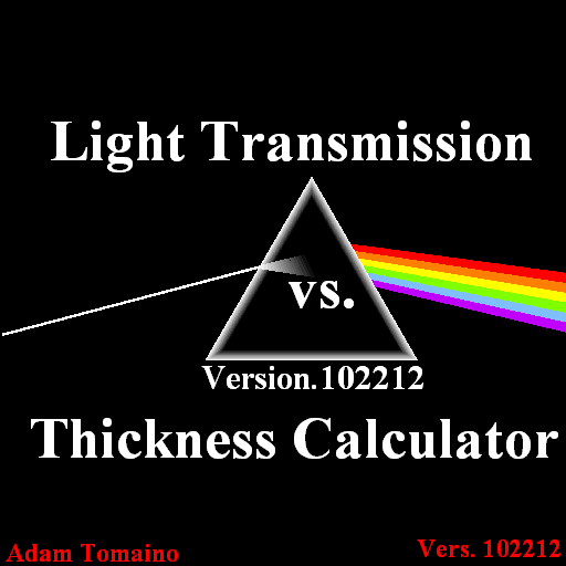 This program allows for calculation of internal transmission loss through transparent materials at varying thicknesses (Beer Lambert's Law) while compensating for first and second surface reflectance losses (calculated as a function of material refractive index [ND20]). The calculations within this program assume light entry normal to materials surface. The calculations within this program also assume parallel material surfaces on both faces of the transparent material.