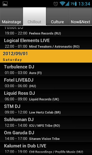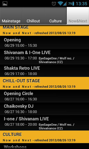 Event timetables for Mainstage, Chill-out and Culture events during festival. You can set timed notification for every future event from any screen by clicking on it.