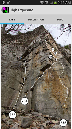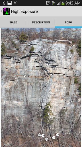 Climbs are accessed from a list searchable by name, grade, or route number. Selecting a climb reveals a base photo, the route's description, and a high resolution zoom-able aerial topo photo. The topographic photos include belays, rappelling information, variations, and new link-ups.