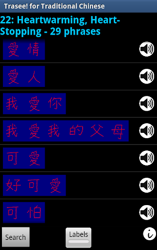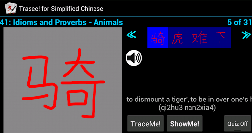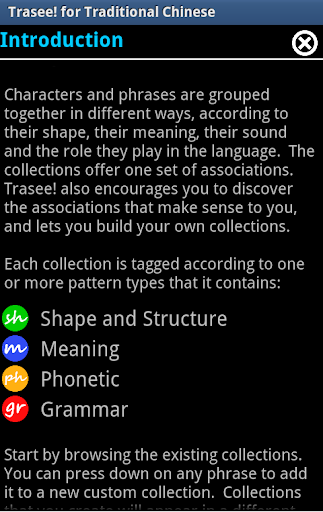 Trasee! is a unique pattern-based system designed to help you quickly start to read and write Chinese, or further improve your skills. The application is organized into collections that start with the basics and build on each other, gradually introducing new patterns.