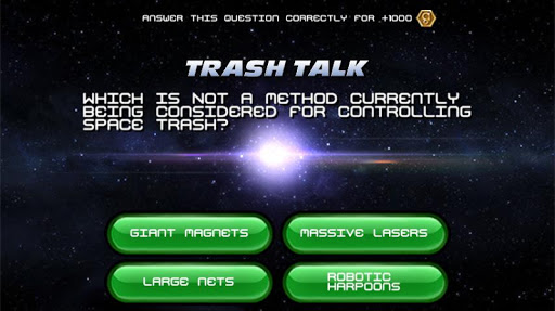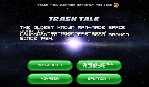 You can also earn credits by answering dozens of trivia questions about space and space junk. "How many nuclear reactors are currently orbiting Earth?" or "What was the name of the first animal in space?". Play Trashtronauts and find out.