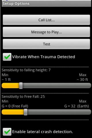 Trauma Responder uses the Android phone built-in accelerometer to detect free-fall or crash conditions while carrying your phone. Free-fall distance and accelerometer sensitivity can be adjusted to give the best performance for a particular situation such as falling from a chair, stepladder or roof. Trauma Responder will automatically ans sequentially call up to four phone numbers, including 911 and play a recorded message of your creation.
