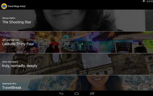 If you love traveling or if you love reading about other people's travel stories, then you'd love this app. This is a very simple and straight forward app which lists all the popular travelers' blogs for you to read. We're adding more blogs everyday. This app does not provide any notification system to notify you of any new blog posts nor does it provide a functionality to interact with any data.
