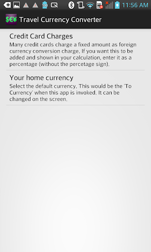 This application helps with converting foreign currencies in to your home currency. It is a handy aid when you are in a foreign country. Just open the app, choose the local currency and enter the value and voila your cost in your home currency appears. The app remembers your configured home currency and credit card add-on charges.